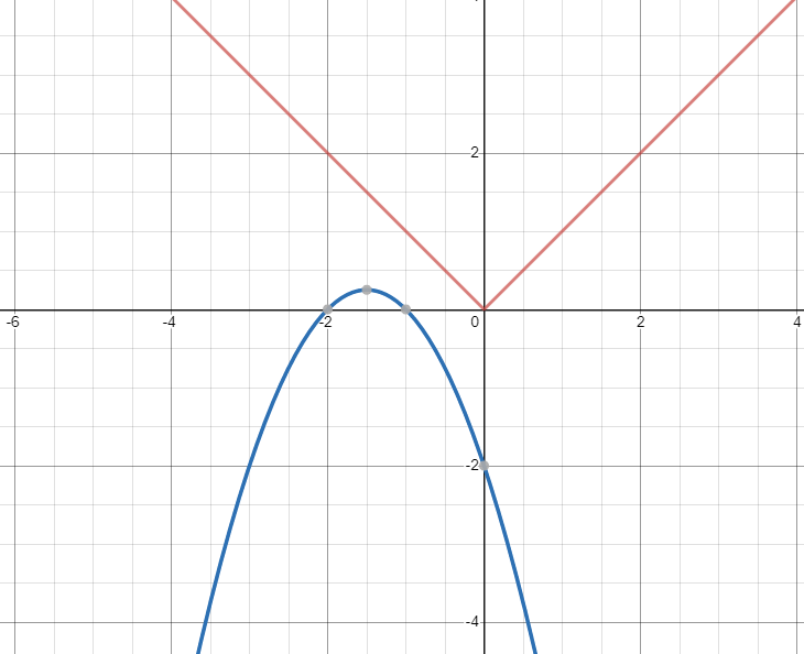 A quick look at the graph reveals that y=|x| is always above the parabola.
