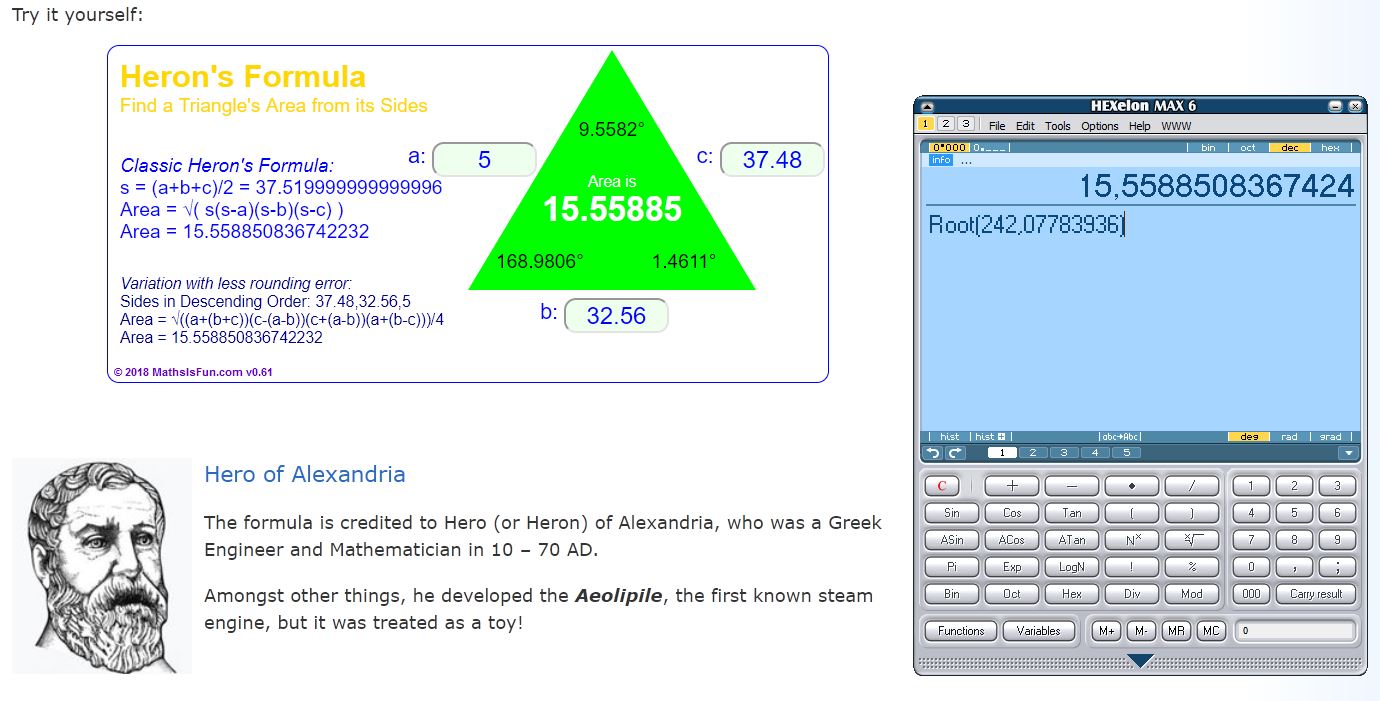 The area is A = \(\sqrt{s\times(s-a)\times(s-b)\times(s-c)} = \sqrt{37.52\times32.52\times 0.04\times 4.96} = \sqrt{242.08} \approx15.56 \)