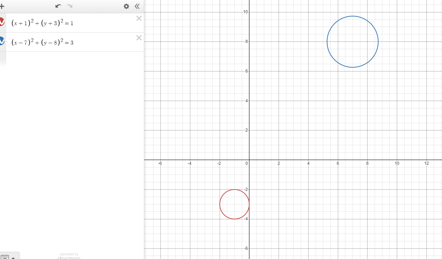 Ok, we will find the distance between the two centers: \(\sqrt{(7+1)^2+(8+3)^2}=\sqrt{185}\)
