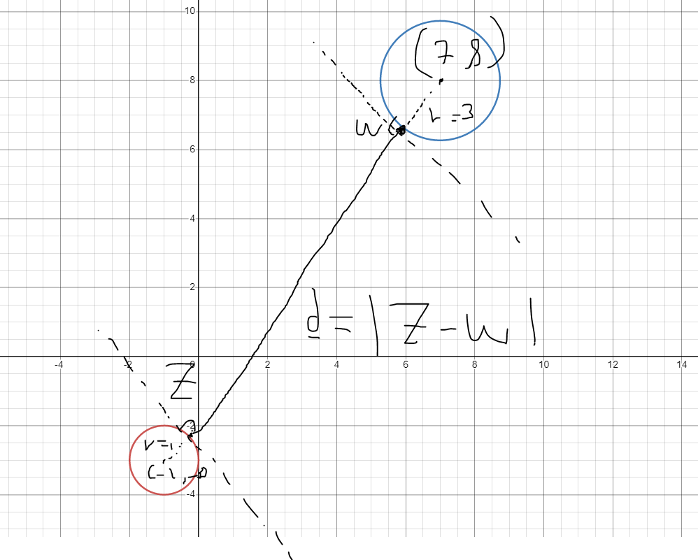 Next: \(\left | w-7-8i\right |=3 \iff \left | w-(7+8i) \right |=3\)
