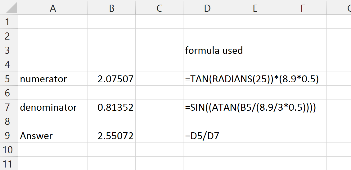 Thanks, will use this if all else fails, trying to get it into just one cell, as the project this equation relates to specifies that we have to use the least amount of calculations possible. But thanks again, was afraid that the question would get lost to the ages. Sincerely