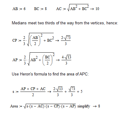 Now....... triangle MBC has an area of (MB * BC) / 2 = (3 * 8) / 2 = 24/2 = 12