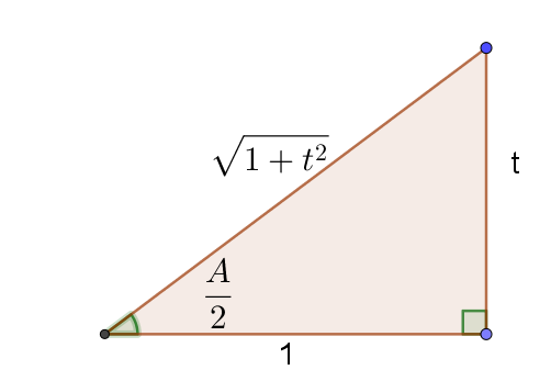 \(TanA\\ =Tan(\frac{A}{2}+\frac{A}{2})\\ =\frac{2tan\frac{A}{2}}{1-tan^2\frac{A}{2}}\\ =\frac{2t}{1-t^2}\\\) | \(cosA\\ =cos(\frac{A}{2}+\frac{A}{2})\\ =cos^2\frac{A}{2}-sin^2\frac{A}{2}\\ =\frac{1}{1+t^2}-\frac{t^2}{1+t^2}\\ =\frac{1-t^2}{1+t^2}\) | \(secA=\frac{1+t^2}{1-t^2}\) |