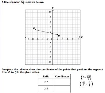 2:7 | x-coordinate = \(-7+\frac{2}{2+7}\cdot|-7-2|\,=\,-7+\frac29\cdot9\,=\,-7+2\,=\,-5\) y-coordinate = \(3-\frac{2}{2+7}\cdot|3-1|\,=\,3-\frac29\cdot2\,=\,3-\frac49\,=\,\frac{23}{9}\) |