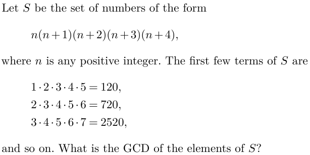 Let $S$ be the set of numbers of the form \[n(n + 1)(n + 2)(n + 3)(n + 4),\] where $n$ is any positive integer.