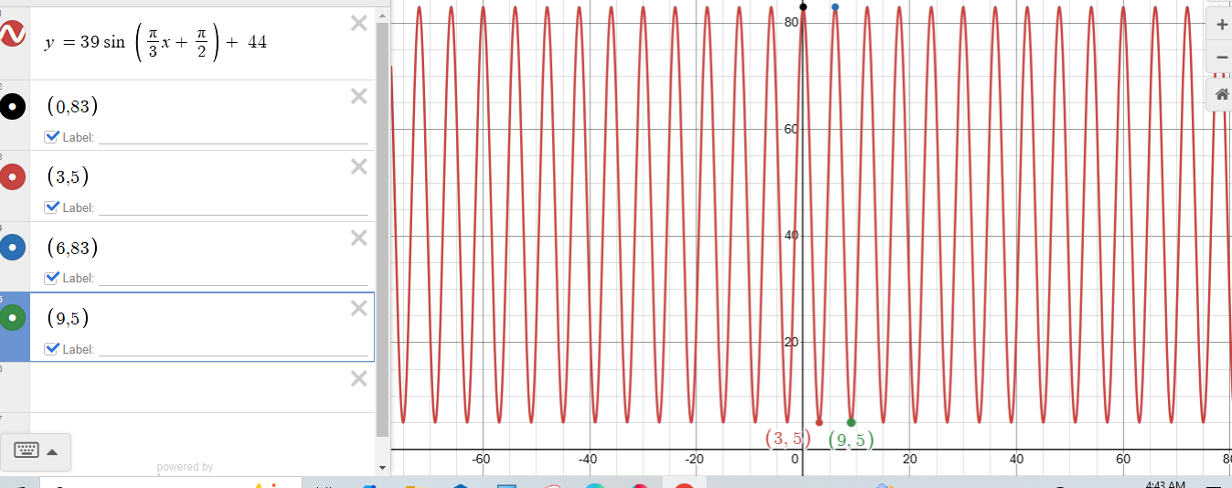 83 = 39 sin (pi/3 * 0 + C) + 44