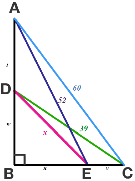 \(\begin{array}{|rcll|} \hline \mathbf{\text{In $\triangle RPQ$ }:} \\ \hline x^2 &=& r^2+r^2 -2rr\cos(2\varphi) \\ x^2 &=& 3^2+3^2 -2*3*3*\left(-\dfrac{108}{ 117 }\right) \\ x^2 &=& 18\left(1+\dfrac{108}{ 117 }\right) \\ x^2 &=& \dfrac{18*225}{ 117 } \\ x^2 &=& \dfrac{225}{ 6.5 } \\ \mathbf{x} &=& \mathbf{\dfrac{15}{ \sqrt{6.5} }} \\ \mathbf{x} &=&\mathbf{ 5.88348405415} \\ \hline \end{array}\)