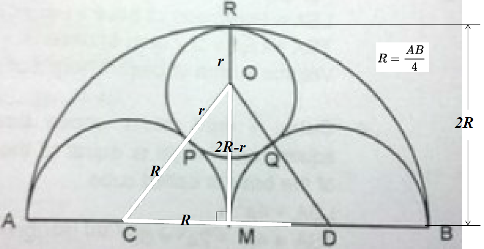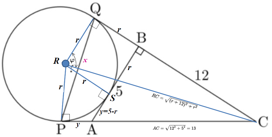 \(\begin{array}{|lrcll|} \hline (1): & PC &=& QC \quad | \quad QC = 12+r,\ PC=y+AC,\ AC= \sqrt{12^2+5^2}= 13 \\ & y+13 &=& 12+r \\ & \mathbf{y} &=& \mathbf{r-1} \\\\ (2): & AS &=& AB - SB \quad | \quad AS=y,\ AB=5,\ SB = r \\ & y &=& 5-r \\ & r &=& 5-y \quad | \quad y=r-1\\ & r &=& 5-(r-1) \\ & r &=& 5-r+1 \\ & 2r &=& 6 \\ & \mathbf{r} &=& \mathbf{3} \\ \hline \end{array}\)