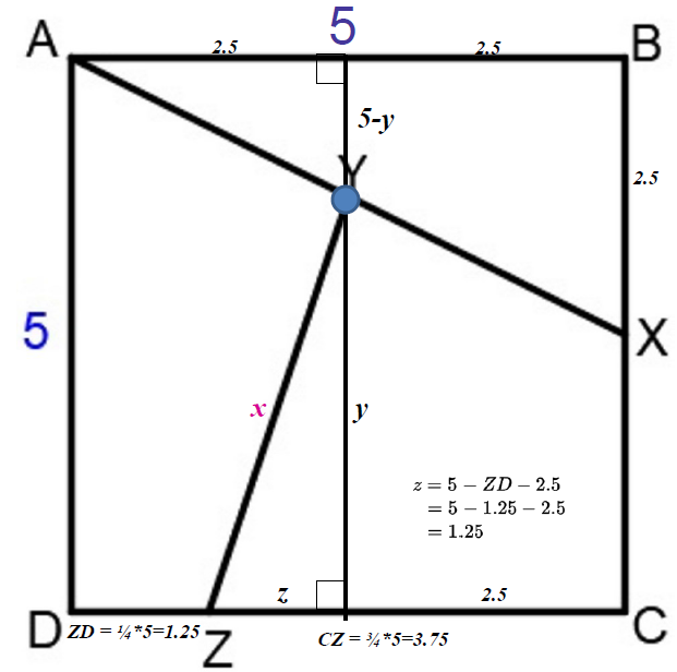 \(\begin{array}{|rcll|} \hline \mathbf{\text{In }\triangle ACD:} \\ \hline \sin(45^\circ+\varphi) &=& \dfrac{a}{8\sqrt{2}} \\\\ \dfrac{\sqrt{2}}{2}\Big(\sin(\varphi)+\cos(\varphi) \Big) &=& \dfrac{a}{8\sqrt{2}} \\\\ 8\Big(\sin(\varphi)+\cos(\varphi) \Big) &=& a \\\\ \mathbf{a} &=&\mathbf{8\Big(\sin(\varphi)+\cos(\varphi) \Big)} \qquad (4) \\ \hline \end{array} \begin{array}{|rcll|} \hline \mathbf{\text{In }\triangle ABC:} \\ \hline \sin(2\varphi) &=& \dfrac{a}{x} \quad | \quad \sin(2\varphi)=\dfrac{2\tan(\varphi)}{1+\tan^2(\varphi)} \\\\ \dfrac{2\tan(\varphi)}{1+\tan^2(\varphi)} &=& \dfrac{a}{x} \\\\ \mathbf{a} &=& \mathbf{\dfrac{2x\tan(\varphi)}{1+\tan^2(\varphi)}} \qquad (5) \\ \hline \end{array} \\ \begin{array}{|lrcll|} \hline (4)=(5): & a = \mathbf{8\Big(\sin(\varphi)+\cos(\varphi) \Big)} &=& \mathbf{\dfrac{2x\tan(\varphi)}{1+\tan^2(\varphi)}} \\\\ & 8\Big(\sin(\varphi)+\cos(\varphi) \Big) &=& \dfrac{2x\tan(\varphi)}{1+\tan^2(\varphi)} \\\\ & 4\Big(\sin(\varphi)+\cos(\varphi) \Big) &=& \dfrac{x\tan(\varphi)}{1+\tan^2(\varphi)} \quad | \quad \cos(\varphi) = \dfrac{1}{ \sqrt{1+\tan^2(\varphi)} } \\\\ & 4\left(\dfrac{1}{ \sqrt{1+\tan^2(\varphi)} } +\sin(\varphi) \right) &=& \dfrac{x\tan(\varphi)}{1+\tan^2(\varphi)} \quad | \quad \sin(\varphi) = -\dfrac{\tan(\varphi)}{ \sqrt{1+\tan^2(\varphi)} } \\\\ & 4\left(\dfrac{1}{ \sqrt{1+\tan^2(\varphi)} } -\dfrac{\tan(\varphi)}{ \sqrt{1+\tan^2(\varphi)} } \right) &=& \dfrac{x\tan(\varphi)}{1+\tan^2(\varphi)} \\\\ & \dfrac{ 4\Big( 1-\tan(\varphi) \Big) } { \sqrt{1+\tan^2(\varphi)} } &=& \dfrac{x\tan(\varphi)}{1+\tan^2(\varphi)} \\\\ & 4\Big( 1-\tan(\varphi) \Big) &=& \dfrac{x\tan(\varphi)\sqrt{1+\tan^2(\varphi)}}{1+\tan^2(\varphi)} \\\\ & 4\Big( 1-\tan(\varphi) \Big) &=& \dfrac{x\tan(\varphi)}{\sqrt{1+\tan^2(\varphi)}} \\\\ & \mathbf{x} &=& \mathbf{ \dfrac{4\sqrt{1+\tan^2(\varphi)}\Big( 1-\tan(\varphi) \Big) } {\tan(\varphi)} } \qquad (6)\\ \hline \end{array}\)
