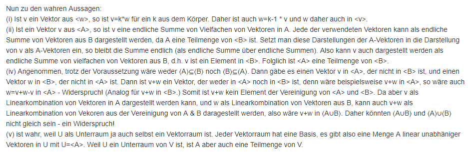 (ii) ist falsch, man betrachte das Gegenbeispiel \(V=\mathbb{R}^2, U= , U'= \rightarrow e_1+e_2 \notin U \cup U', aber \ e_1 \in U \cup U' \& e_2 \in U \cup U'\) .