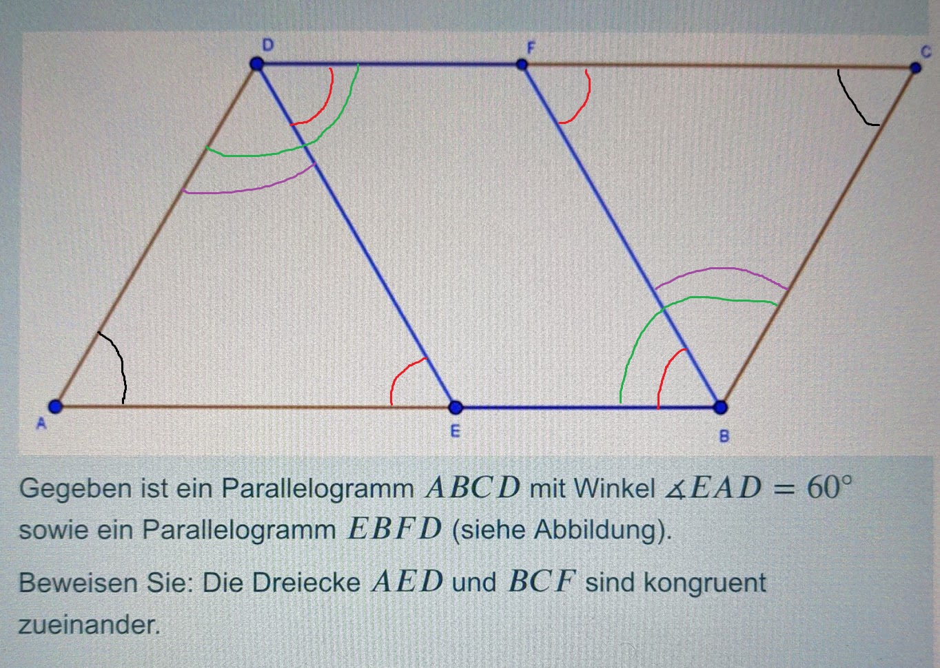 Gleichfarbige Winkel sind gleich. Die roten Winkel sind gleich, weil sie Stufenwinkel / Z-Winkel sind und weil ED und BF parallel sind. Die grünen sind gleich groß, weil ABCD ein Parallelogramm ist. Weil die grünen und roten gleich groß sind, sind auch die lilanen gleich groß. Schließlich sind die schwarzen gleich groß weil ABCD ein Parallelogramm ist. In den Dreiecken sind also alle Winkel gleich. Weil EBDF ein Parallelogramm ist, sind die Seiten zwischen den roten & lilanen Winkeln in den Dreiecken gleich lang. Es sind alle Winkel und eine Seite gleich, daher müssen die Dreiecke kongruent sein.